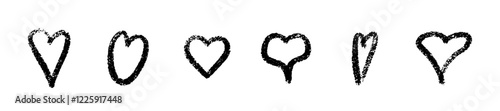 Crayon heart set of black sketched shapes with rough textured edges - grunge hand drawn love symbols in different sizes. Romantic decorative elements for valentine design.