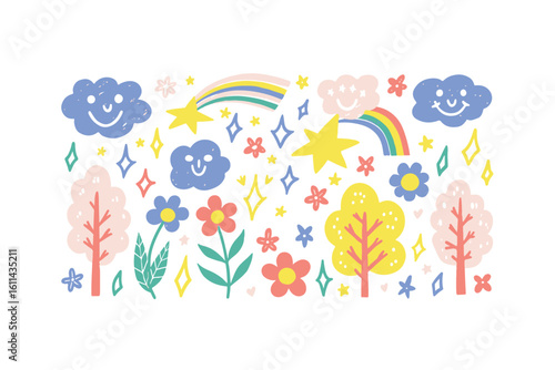 Crayon-style doodle art of whimsical flowers, sparkling stars, trees, and happy clouds that capture a dreamy, fairy-tale essence with cheerful, lighthearted energy.