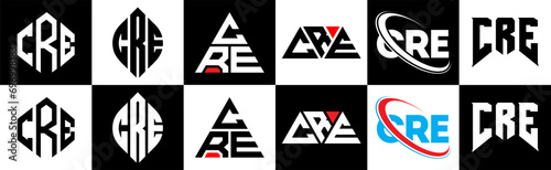CRE letter logo design in six style. CRE polygon, circle, triangle, hexagon, flat and simple style with black and white color variation letter logo set in one artboard. CRE minimalist and classic logo