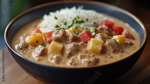 Creamy beef stew with rice, vegetables, close-up, dark background, food blog