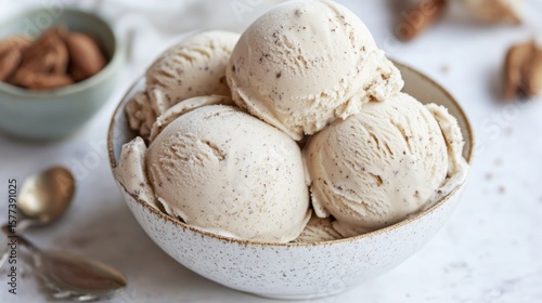 Creamy Bourbon Vanilla Ice Cream Scoops in Rustic Bowl Setting
