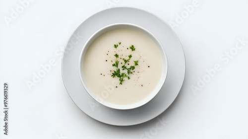 Creamy cauliflower soup garnished with fresh parsley on white plate