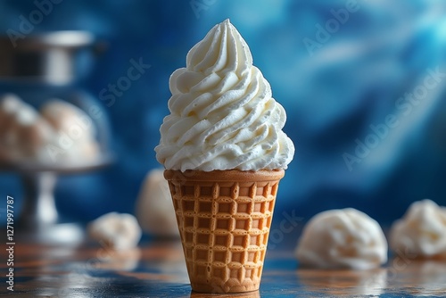Creamy dessert delight in a classic waffle cone at a summer fair. Generative AI