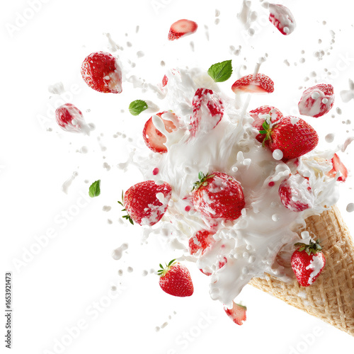 Creamy dessert in a waffle cone with strawberries, exploding with a splash of cream