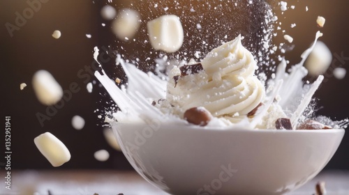 Creamy Dessert with Chocolate and Nuts in Milk Splash