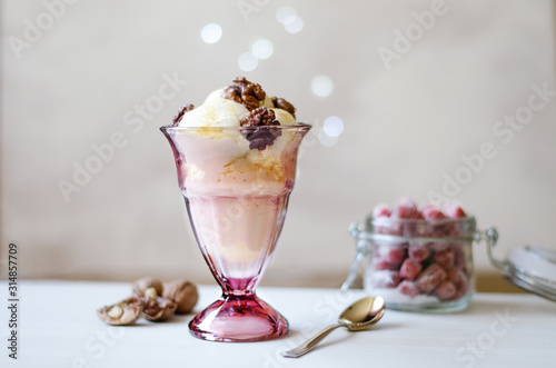 Creamy ice cream with honey and walnuts. Served in a bowl with ice cream, garnished with walnuts and honey. On the table is a jar with dried strawberries, a spoon and a walnut.