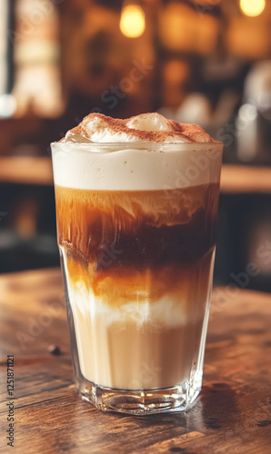Creamy iced coffee drink served in a clear glass highlighting layers and toppings in a cozy cafe setting