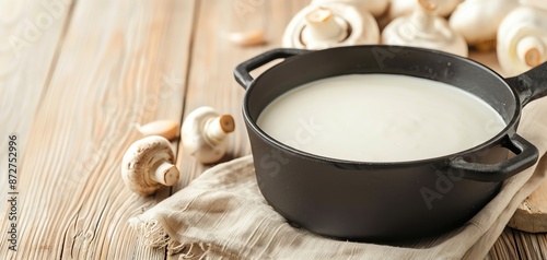 Creamy mushroom soup in a black cast-iron pot placed on a rustic wooden table with mushrooms and garlic in the background.