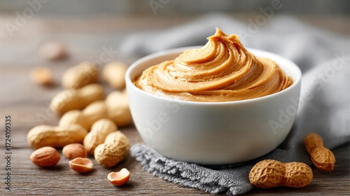 Creamy peanut butter in a white bowl with peanuts on a wooden surface.