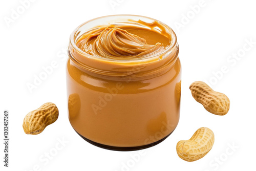 Creamy peanut butter jar gleaming with delicious texture beside fresh peanuts on a white backdrop isolated on transparent background