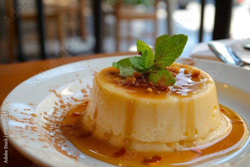 Creamy pudding dessert served on a white plate, topped with caramel sauce, chopped nuts, and a fresh mint leaf, ready to be enjoyed in a restaurant setting