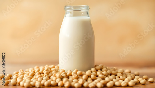 Creamy Soy Milk in a Bottle: A close-up shot showcasing a full glass bottle of creamy soy milk, beautifully presented on a bed of fresh soybeans. Ideal for illustrating the dairy-free goodness.