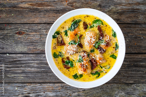 Creamy Tuscan chicken with parmesan, spinach and sun dried tomatoes.