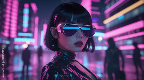 Create a cyberpunk anime-style night illustration featuring a curvy, beautiful woman with elegant glasses. She stands confidently in the foreground, her charisma illuminated by neon lights. In the bac