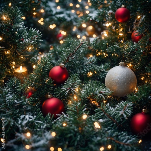 Create a festive Christmas wallpaper featuring a snow-dusted background adorned with lush green pine branches.