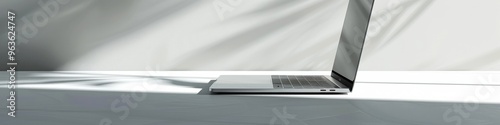 Create a minimalist image with a sleek laptop positioned in the top right corner on a light gray background.