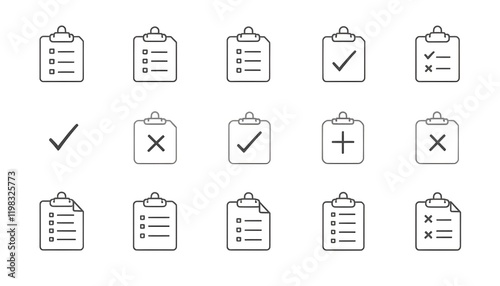 Create a set of clipboard icons in outline style, featuring checkmarks, lists, and crosses, representing tasks and statuses.