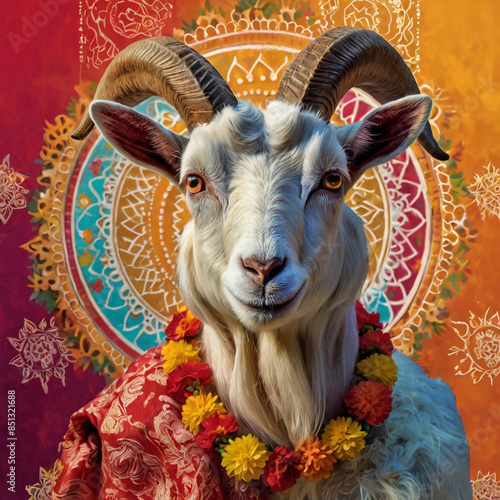 Create a vibrant and festive image celebrating Bakra Eid, featuring a beautifully decorated goat
