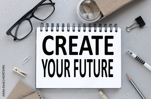 Create your future. text on white notepad paper. near a magnifying glass, pencil, pens on a gray background.