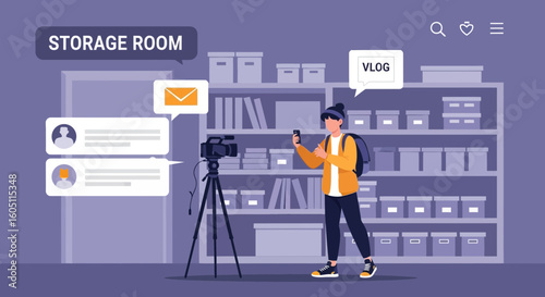 Creating Content For Vlog In Storage Room With Shelves And Camera