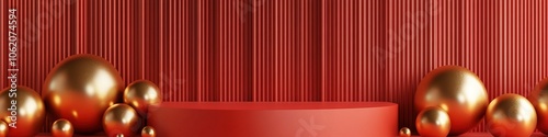 Creative Abstract Marketing Background Featuring 3D Rendered Red Background with Golden Geometric Shapes, Showcasing a Podium for Product Display in a Minimalist Style. The Design Includes Golden Circ