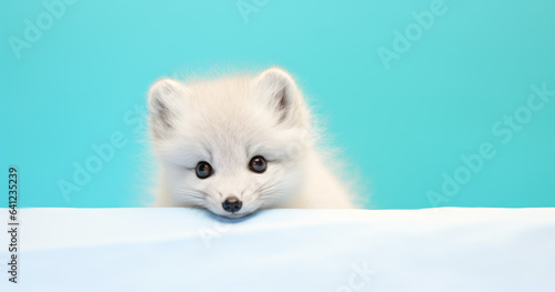 Creative animal concept. Artic Fox peeking over pastel bright background. advertisement, banner, card. copy text space. birthday party invite invitation