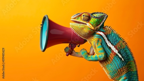 Creative announcement concept. A vibrant chameleon appears to be shouting into a megaphone against a solid orange background, showcasing a playful mix of wildlife