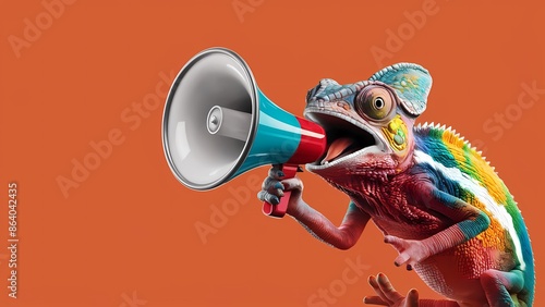 Creative announcement concept. A vibrant chameleon appears to be shouting into a megaphone against a solid orange background, showcasing a playful mix of wildlife