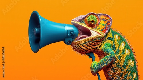 Creative announcement concept. A vibrant chameleon appears to be shouting into a megaphone against a solid orange background, showcasing a playful mix of wildlife illustration