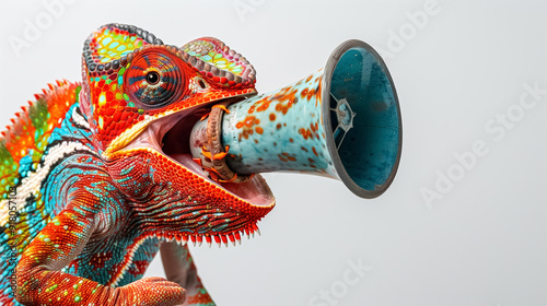 Creative Announcement Concept with a Vibrant Chameleon Reptile Using a Megaphone on White Background
