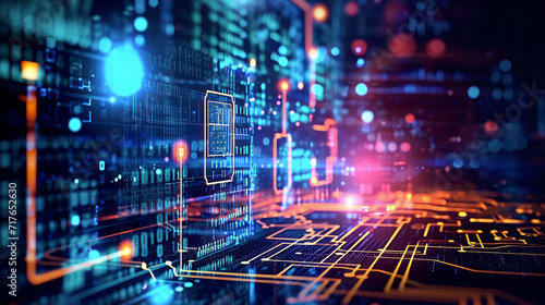 creative backdrop digital board with electronic circuits in multispectral light shades, illustrating concept of modern technology and information flow in techno art style