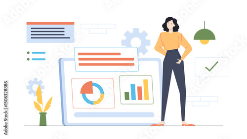 Creative businesswoman analyzing charts on computer screen, suitable for financial statistics presentation in business and technology concepts.