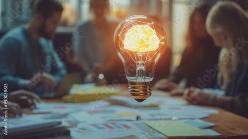 Creative Collaboration at the Work Desk with Brain Bulbs on, Representing Innovative Ideas and Dynamic Team Synergy