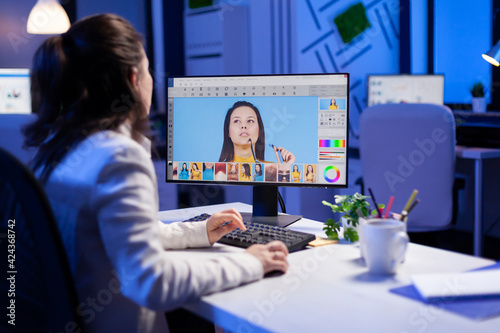 Creative creator doing portrait retouch using color grade late at night in professional editing office. Graphic editor retouching photos of a client on performance pc before deadline