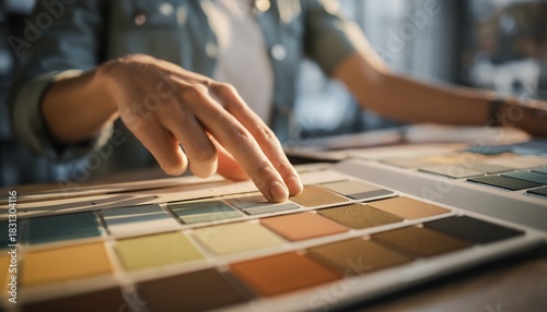 Creative designer expertly selects perfect color swatches for inspired interior design project, crafting vibrant spaces with meticulous color palettes