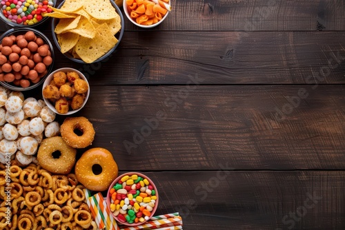 Creative flat lay showcasing a variety of snacks and beverages arranged neatly The image displays a variety of snacks and beverages artfully arranged