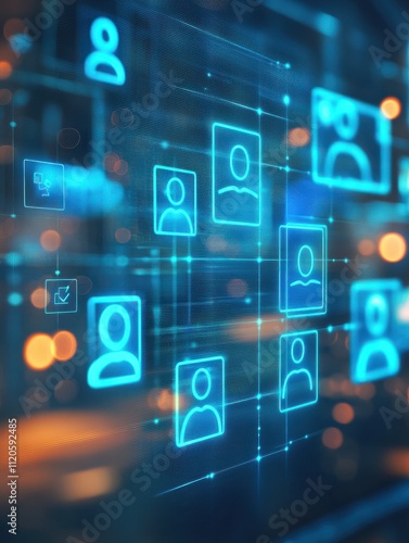 Creative glowing blue business interface on blurry background with empty mock up place. Human resources and online recruitment concept. 3D Rendering