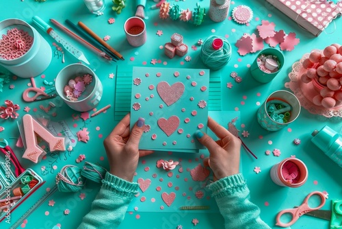 Creative Hands Crafting a Heart-Themed Greeting Card with Decorative Elements on Aqua Background