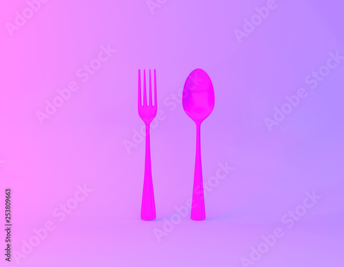 Creative idea layout made of spoons and forks in vibrant bold gradient purple and blue holographic colors background. minimal healthcare and food concept.
