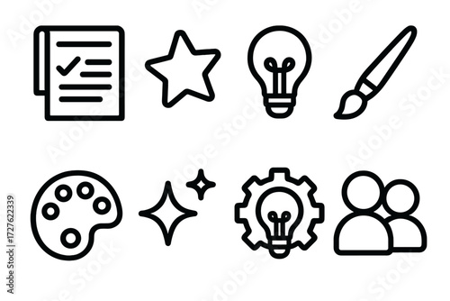 Creative Learning Icons. Creative learning icons in outline style: how-to note, doodle star, idea bulb, paintbrush, palette, sparkles, innovation