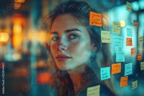 Creative professional brainstorming ideas with colorful sticky notes on a reflective board