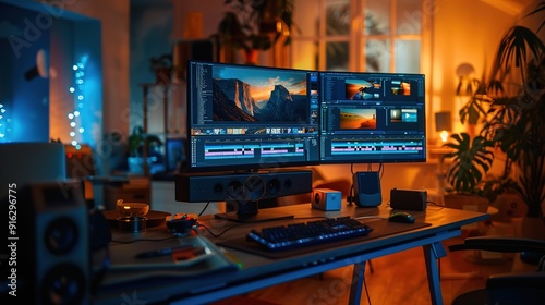 Creative Professional Editing Video on Multiple Monitors in a Modern Office with Winter Night View, Colorful Lighting, and High Resolution Technology