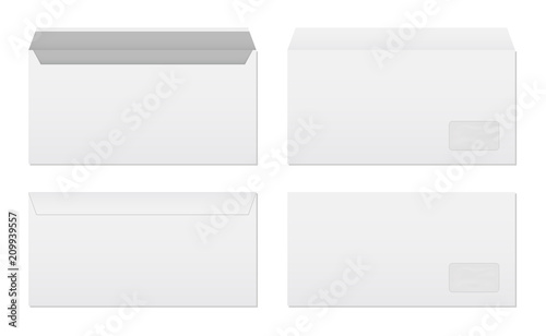 Creative vector illustration of white blank paper envelopes template set isolated on transparent background. International standard sizes. Art design empty example packing letter. Graphic element