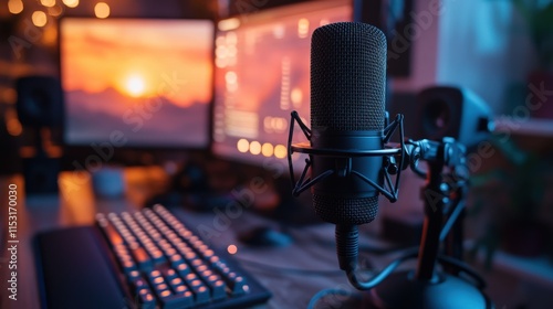 Creative Workspace Featuring a Microphone and Two Computer Screens at Sunset. Generative AI