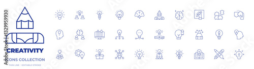 Creativity icons collection. Thin Line icons, editable stroke. brainstorming, idea, puzzle, viral, brain, brainstorm, light bulb, team, creative, creativity