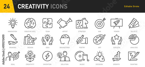 Creativity web icons in line style. Creativity, Finding solution, Brainstorming, technology, teamwork, Inspiration, Creative thinking, Brain. Vector illustration.