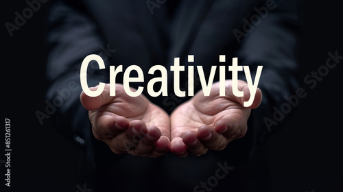 Creativity word on the hand of a businessman. Text symbol concept. Copy space.