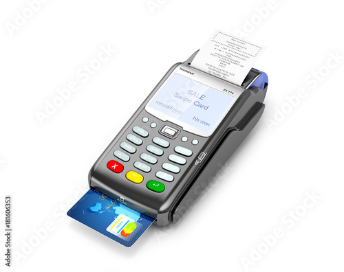 Credit card and card reader machine on a white background. 3D illustration
