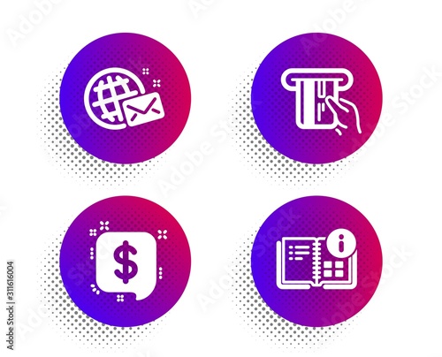 Credit card, Payment message and World mail icons simple set. Halftone dots button. Instruction info sign. Atm payment, Finance, Chat. Project. Business set. Classic flat credit card icon. Vector