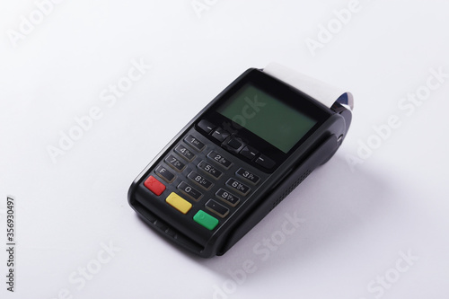 Credit Card Reader isolated on white background. POS Terminal With Receipt Printer. Card Machine. Credit Cards. Payments and Transactions. Retail Equipment. Contactless Payment. NFC.